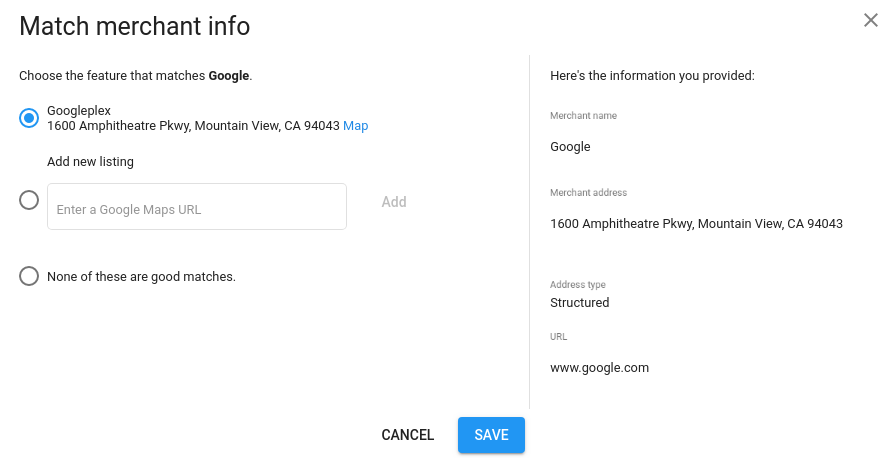 您必须先确保 Feed 中的信息与 Google 地图上的商家信息匹配(二者均准确无误),然后再在合作伙伴门户中提供匹配建议。