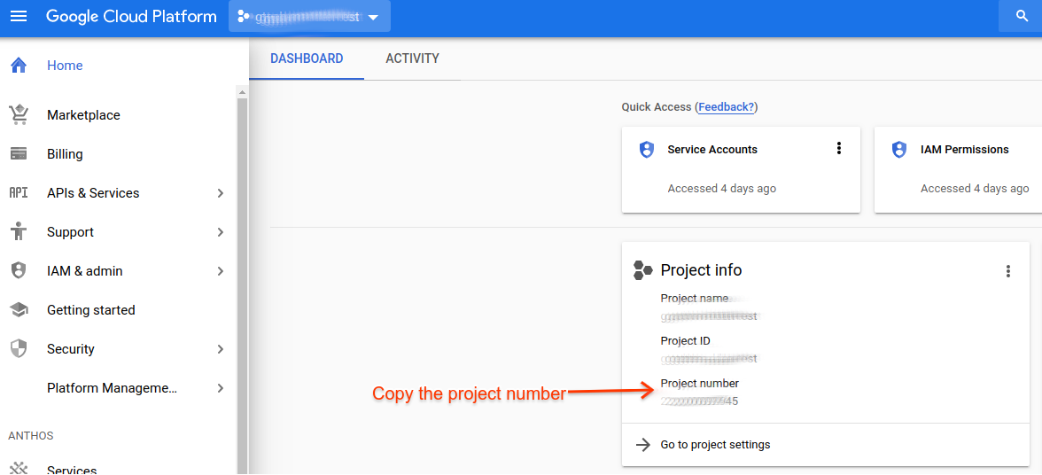 • 请记下云项目编号,因为您在后续步骤中需要用到它。您也可以在 Google Cloud Platform 首页上找到您的云项目编号。Cloud 项目编号始终仅包含数字。
