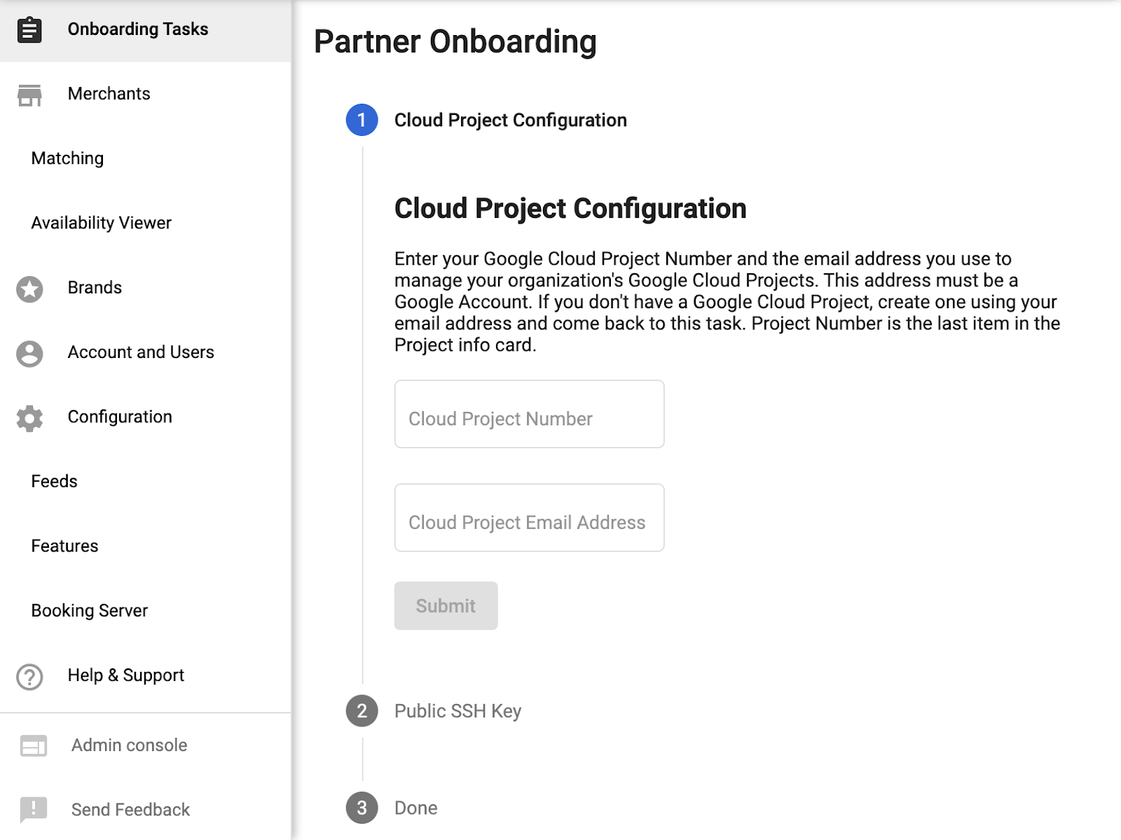 4. 在合作伙伴门户的“新手入门任务”页面上,完成第 1 步,即提交 Cloud 项目编号和 Cloud 项目电子邮件地址(用于管理 Cloud 项目的电子邮件地址)。