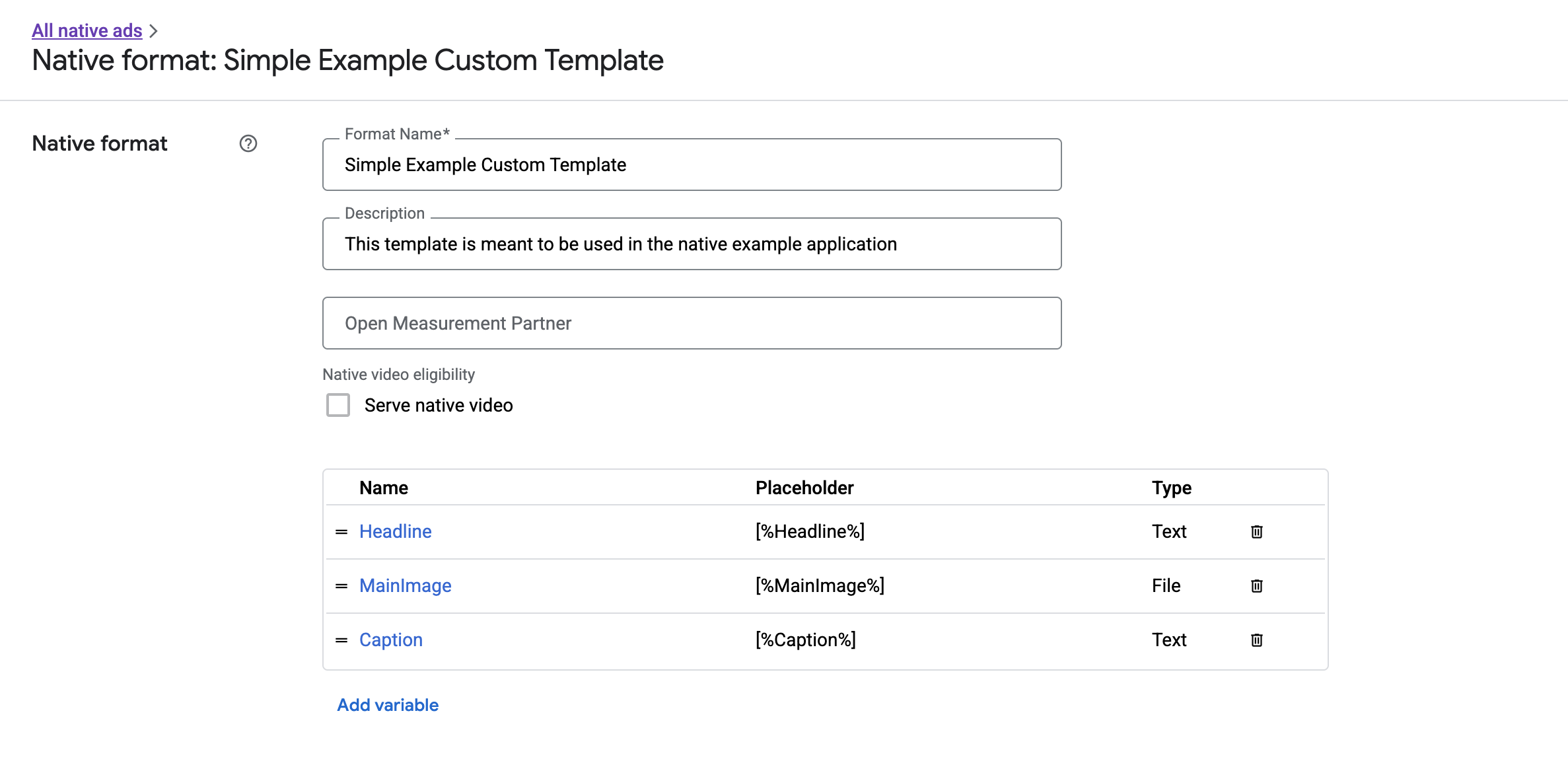 รหัสรูปแบบของโฆษณาเนทีฟที่กําหนดเองแต่ละรายการจะปรากฏข้างชื่อ การคลิกชื่อใดชื่อหนึ่งจะนำคุณไปยังหน้าจอรายละเอียด ซึ่งแสดงข้อมูลเกี่ยวกับฟิลด์ของรูปแบบ