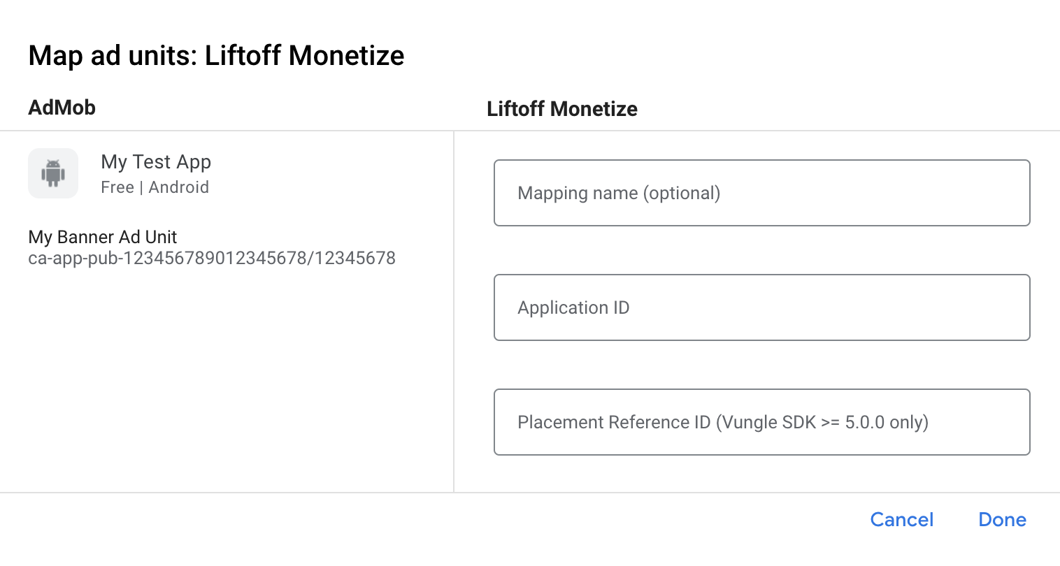 이 가이드에서는 Google 모바일 광고 SDK를 사용하여 AdMob 미디에이션을 통해 Liftoff Monetize의 광고를 로드하고 표시하는 방법을 보여주며, 입찰 및 폭포식 구조 통합을 모두 다룹니다. 광고 단위의 미디에이션 구성에 Liftoff Monetize를 추가하는 방법과 Vungle SDK 및 어댑터를 Android 앱에 통합하는 방법을 설명합니다.