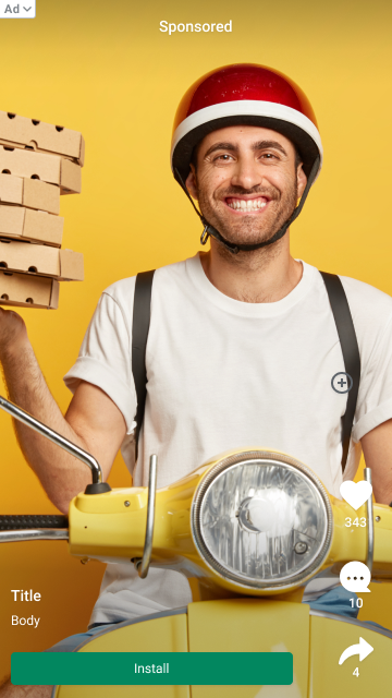 The native ad format can be used to create any size of ad, including full-screen ads like those that are highly popular in social and entertainment apps. Full-screen native ads can improve revenue and retention, either through matching the style of existing full-screen content experiences such as in social apps, or through providing a means to place ads in "stories" feeds. Here are some examples of full-screen native ads: