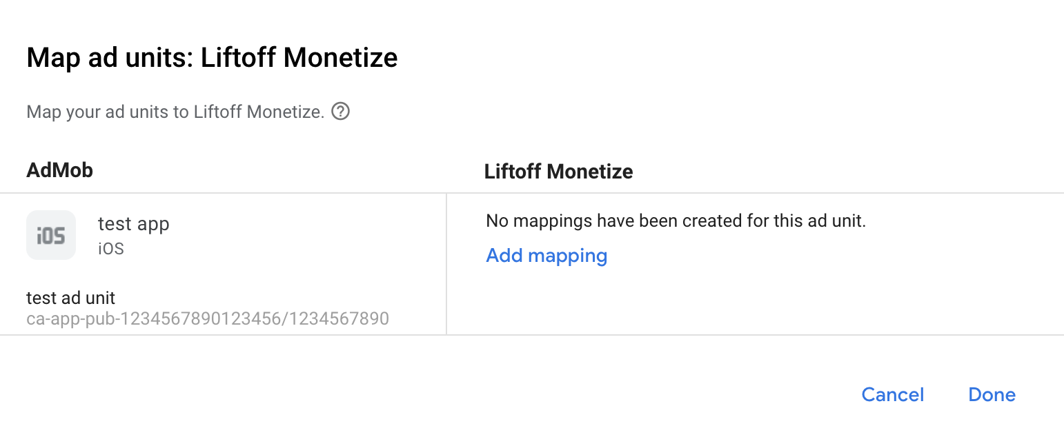 Si vous avez déjà une mise en correspondance pour Liftoff Monetize, vous pouvez la sélectionner. Sinon, cliquez sur Ajouter un mappage.