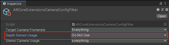 If your app doesn’t require Depth, you can prevent ARCore from using the depth sensor. On devices that have a supported depth sensor, ARCore ARCore prioritizes camera configs that use the depth sensor. To filter out all camera configs that use the depth sensor, make sure that Depth Sensor Usage is set to Do Not Use.