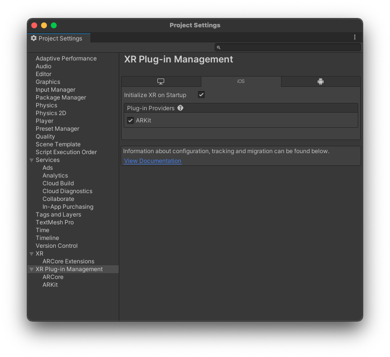 Navigate to Edit > Project Settings. In XR Plug-in Management, open the iOS tab and enable ARKit.
