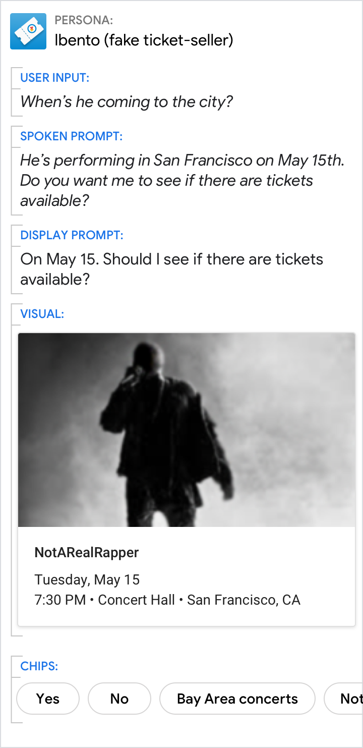Usa los mensajes de voz y de visualización para dar la respuesta específica a la pregunta dirigida del usuario (11:30 a.m. en este ejemplo). Usa las imágenes para obtener detalles relacionados.