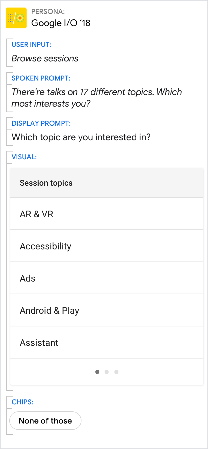 רשימות וקרוסלות עוברות אופטימיזציה כדי לעזור למשתמשים לבחור. במקרים כאלה, אפשר להשתמש בצ'יפים כדי לעזור למשתמשים לצמצם את הרשימה או להגיד שהם לא רוצים באף אחת מהאפשרויות האלה.