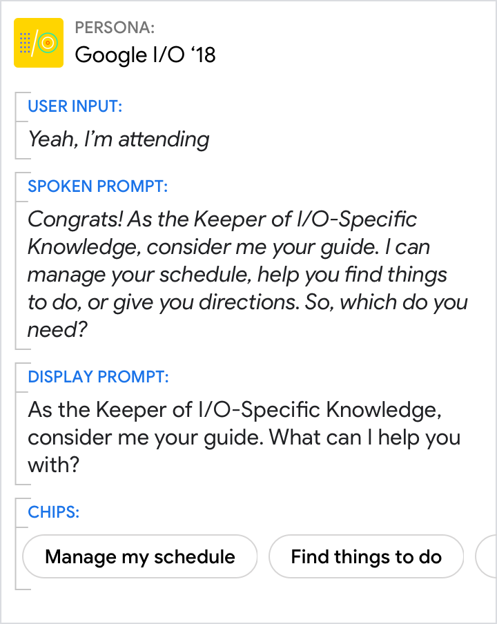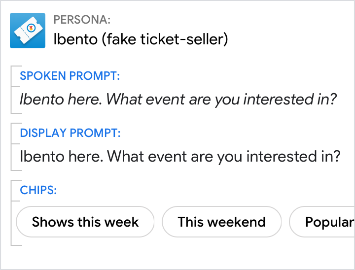 | תגובת משתמש | כברירת מחדל, כשמשתמש מקיש על צ'יפ, הטקסט של הצ'יפ הופך לתגובת המשתמש. לכן, חשוב לכלול את כל הצ'יפים כביטויי אימון שגורמים לכוונה. אם משתמשים ב-Dialogflow, אפשר להיכנס לכאן כדי לקרוא מידע נוסף על כוונות. |