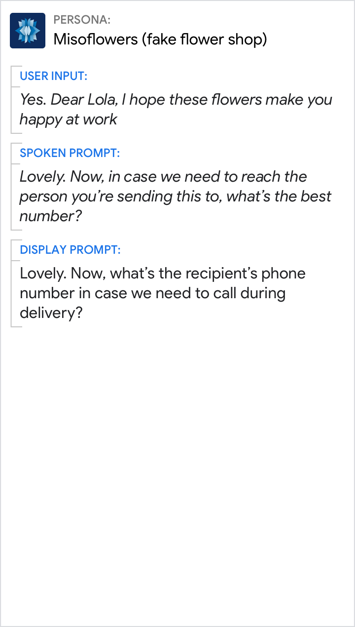 「確認」分頁可讓使用者瞭解自己輸入的內容。這麼做不僅可以幫助使用者立即修正錯誤,也能透過共同的溝通方式,讓使用者以社交方式與社群溝通互動。此外,確認訊息有助於維護背景,讓對話得以延續。