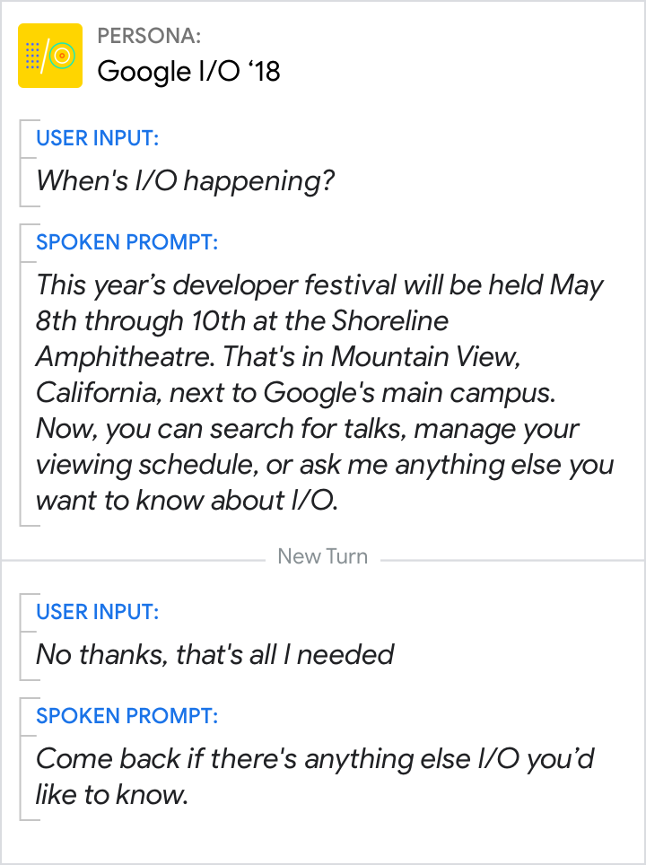 Anche se le intenzioni sono solide, c'è ancora spazio per gli errori. Gli utenti potrebbero ignorare lo script restando in silenzio (un errore No Input) o dire qualcosa di imprevisto (un errore No Match). Utilizza i messaggi di errore per indirizzare delicatamente gli utenti verso percorsi riusciti o per reimpostare le loro aspettative su ciò che è o non è possibile.