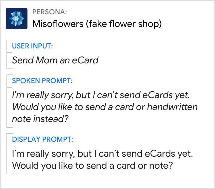 Xin lưu ý rằng các tuỳ chọn "exit", "huỷ", "dừng", "bỏ qua" và "tạm biệt" được hỗ trợ theo mặc định. Vì vậy, nếu người dùng nói như vậy, thì Hành động của bạn sẽ kết thúc. Hãy xem phần Số lần thoát ứng dụng để biết thêm thông tin.