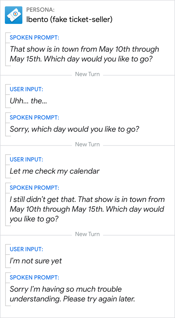Kết thúc cuộc trò chuyện sau nhiều lần nhận ra lỗi. Hãy xem xét những lỗi này để xem liệu bạn có thể cải thiện Hành động bằng cách nào hay không, chẳng hạn như thêm khả năng lưu một sự kiện để dùng sau này.