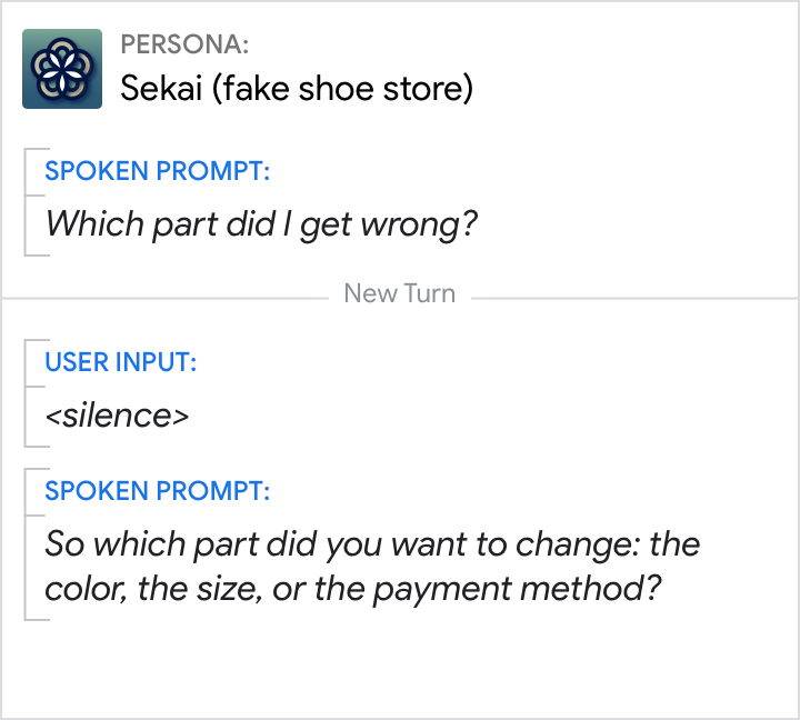 N'ayez pas peur de poser une question à l'utilisateur. Cela ne signifie pas que vous devez accepter toutes les réponses imaginables. La façon dont une question est formulée définit les attentes de l'utilisateur par rapport à ce qu'il peut dire. Vous pouvez poser des questions variées ou plus génériques, ou bien poser des questions plus ou plus courtes.La magie et l'art d'une conversation de qualité réside dans le fait que les utilisateurs ont le sentiment qu'ils ont le contrôle et qu'ils peuvent dire n'importe quoi à tout moment. En réalité, la boîte de dialogue les oriente le long de chemins prescrits.
