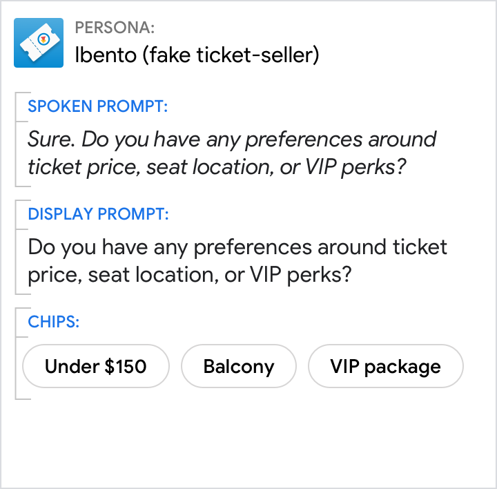 Esto es adecuado para conversaciones en bocinas inteligentes, auriculares, pantallas inteligentes o el vehículo. Aunque algunos de estos dispositivos tienen pantallas, no hay garantía de que el usuario la esté mirando o esté lo suficientemente cerca como para interactuar con los chips, por lo que las sugerencias deben incluirse en los mensajes de voz.