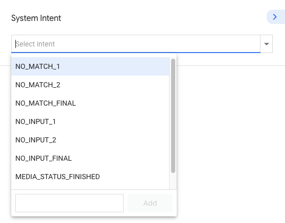 - 在 Develop 标签页中,点击 System intent。一组系统 intent 例如 NO_MATCH、NO_INPUT 和 CANCEL。