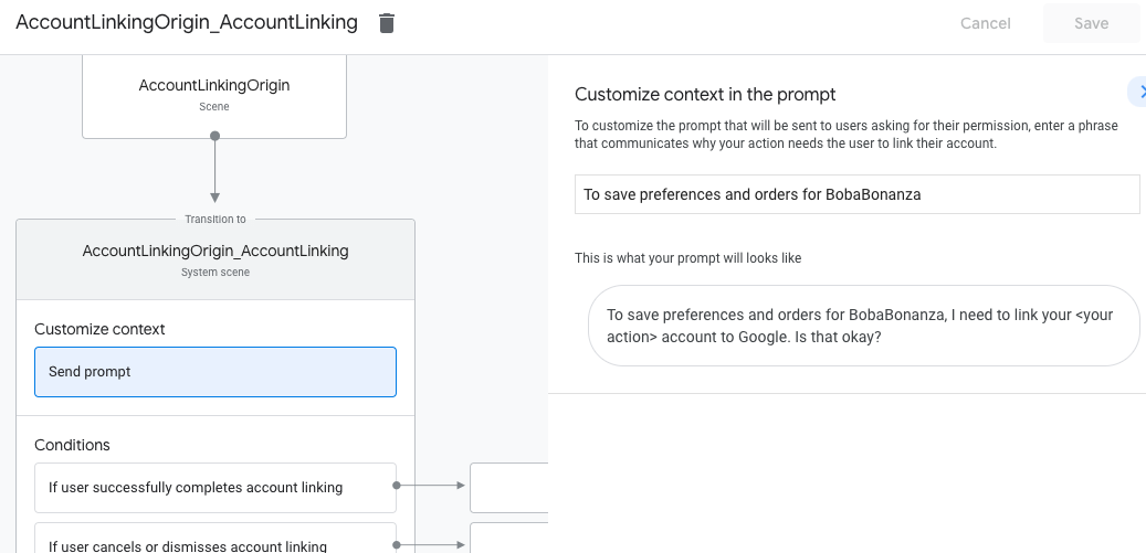 - اگر کاربر با پیوند دادن حساب خود موافقت نکرد، نحوه جریان را پیکربندی کنید. به عنوان مثال، یک پیام تأیید ارسال کنید و به صحنههایی هدایت کنید که عملکردی را ارائه میکنند که نیازی به پیوند دادن حساب ندارد.