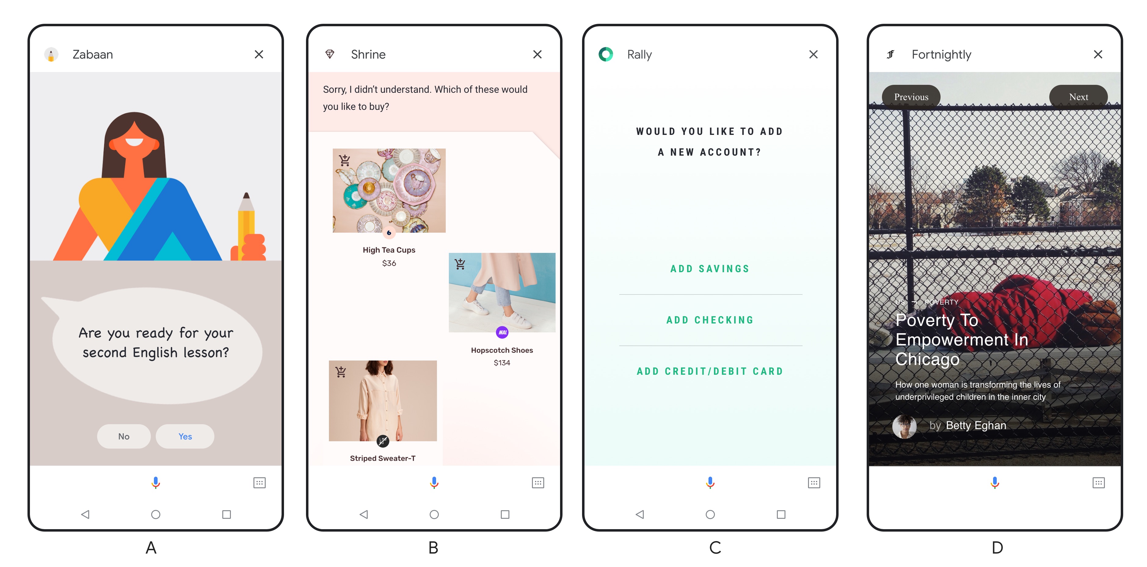 • 한 번에 하나의 터치 포인트에 집중하세요. 한 번에 한 가지 유형의 주요 정보나 작업을 표시하여 인지 워크로드를 줄이고 콘텐츠를 멀리서도 읽을 수 있도록 합니다. 예를 들어 사용자가 "오늘은 어때?"라고 물으면 Google 어시스턴트가 날씨, 캘린더, 출퇴근길 정보, 뉴스 콘텐츠로 응답합니다. 각 콘텐츠 유형은 전체 화면을 차지하며 화면에 모두 한 번에 표시되지 않고 순차적으로 표시됩니다.