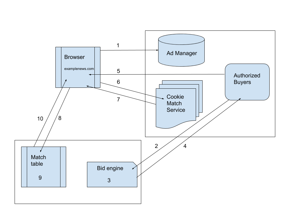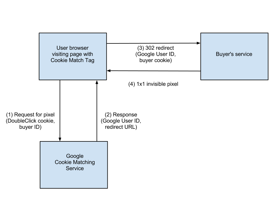Dans le contexte de la publicité numérique, Google identifie les utilisateurs à l'aide de cookies appartenant au domaine doubleclick.net. Les enchérisseurs participant aux enchères en temps réel peuvent avoir leur propre domaine dans lequel ils identifient un ensemble d'utilisateurs auxquels ils souhaitent diffuser des annonces. La mise en correspondance des cookies permet à l'enchérisseur de faire correspondre ses cookies à ceux de Google. Il peut ainsi déterminer si une impression envoyée dans une demande d'enchères est associée à l'un des utilisateurs ciblés. Il recevra alors ses propres données de cookie ou un ID utilisateur Google spécifique à l'enchérisseur, qui est une forme chiffrée du cookie doubleclick.net dans la demande d'enchères.