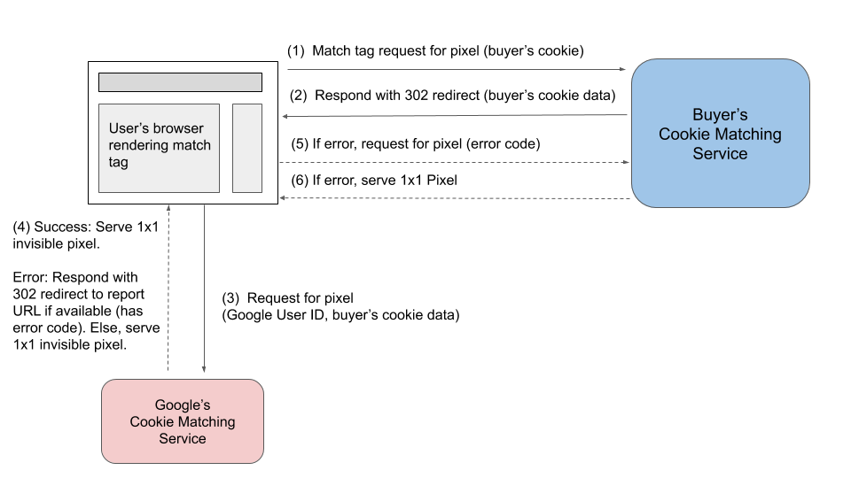 Google recevra une redirection contenant les paramètres que vous avez spécifiés, en plus du cookie de Google dans les en-têtes HTTP. Si l'opération a réussi, les impressions pour cet utilisateur dans les demandes d'enchères suivantes incluront les données de correspondance hébergées de l'enchérisseur dans BidRequest.user.buyeruid.