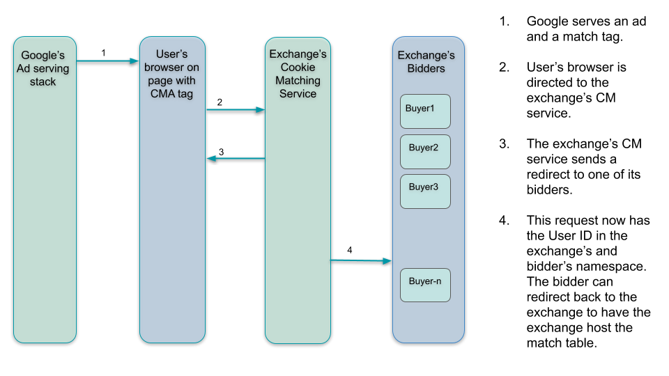 پیشنهاد دهنده یک تغییر مسیر به URL مطابق کوکی خود شامل پارامترهایی که در مرحله اول مشخص کرده است و پارامترهایی که Google در مرحله دوم ارائه کرده است دریافت می کند. علاوه بر این، آنها کوکی خود را در هدرهای HTTP نیز دریافت خواهند کرد. اگر عملیات موفقیتآمیز بود، پیشنهاد دهندهای که میز تطابق خود را میزبانی میکند، میتواند کوکی خود را با شناسه کاربر Google موجود در پاسخ مطابقت دهد. توصیه می شود که پیشنهاد دهندگان رشته دقیقی را که توسط سرویس تطبیق کوکی برگردانده شده است ذخیره کنند.