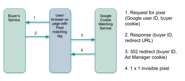 وقتی صفحه ناشر شرکتکننده در مرورگر کاربر بارگیری میشود، و یک جایگاه تبلیغاتی در آن صفحه توسط Google پر میشود، ممکن است یک برچسب تطبیقی قرار داده شود که از یک پیشنهاددهنده الگوریتمی انتخاب شده یک پیکسل درخواست میکند. تگ Pixel Matching که توسط Google قرار داده شده است، URL تطبیق کوکی پیشنهاد دهنده را با پارامترهای اضافی ترکیب می کند که پیشنهاد دهنده می تواند برای پر کردن جدول مطابق خود از آنها استفاده کند. برای یک URL تطبیق کوکی که به عنوان https://ad.network.com/pixel مشخص شده است، ساختار آن به صورت زیر است: