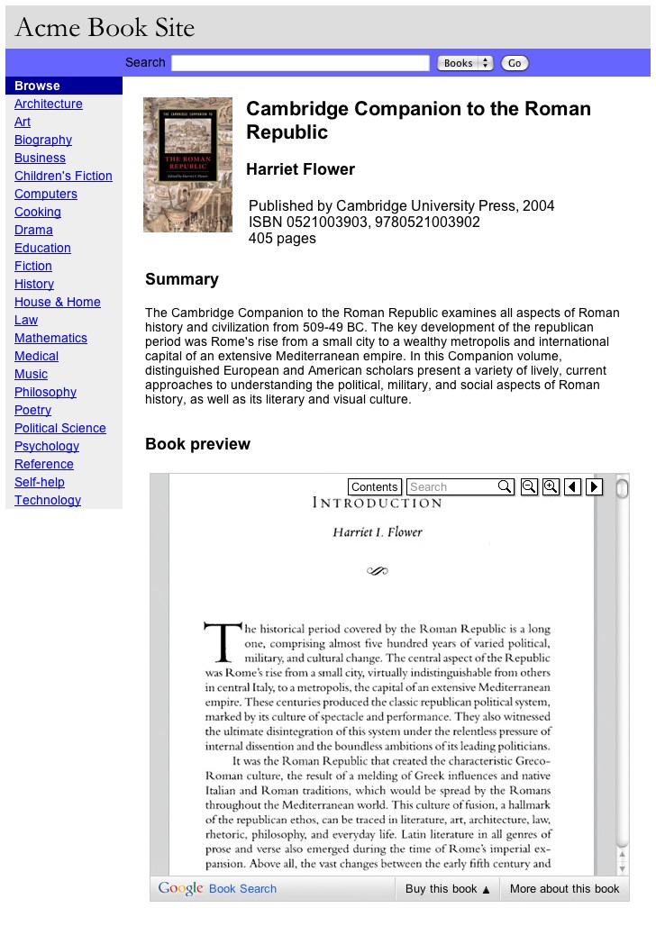 Neste exemplo, um leitor incorporado é inserido em um cabeçalho ""Prévia do livro" na página do livro. Você pode implementar isso usando o Dynamic Links e o Visualizador incorporado. Conforme especificado na seção de nomeação, também é possível usar "Visualização do Google" ou apenas "Visualizar" para o cabeçalho. |