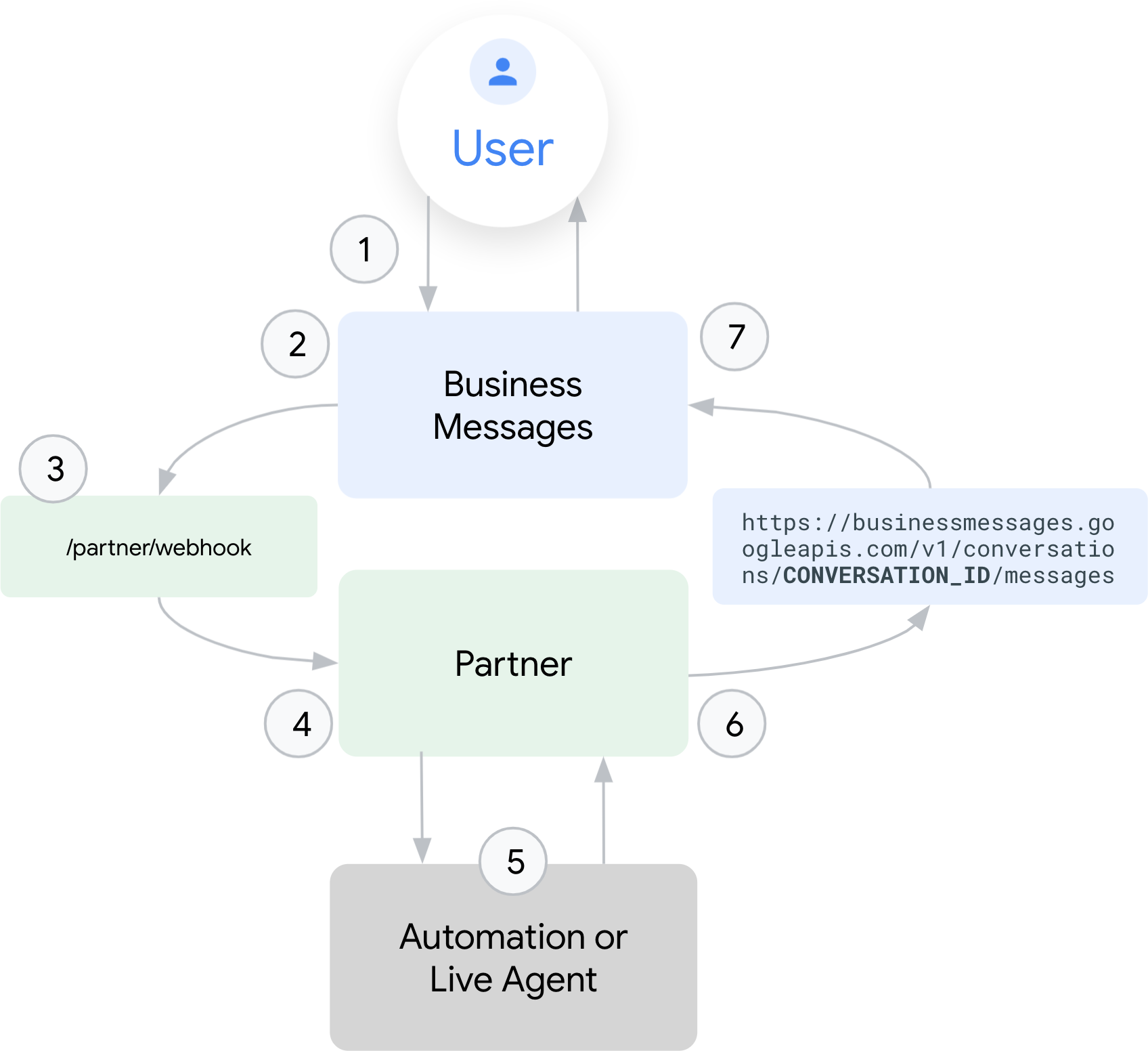 شریک به نمایندگی از یک برند، نماینده را مدیریت می کند. شرکا پیامهای ورودی را در یک وبقلاب مشخص دریافت میکنند ، پیامهای ورودی را به اتوماسیون یا نمایندگان زنده برای نوشتن پاسخها هدایت میکنند، و پیامهای خروجی را به Business Messages API ارسال میکنند.