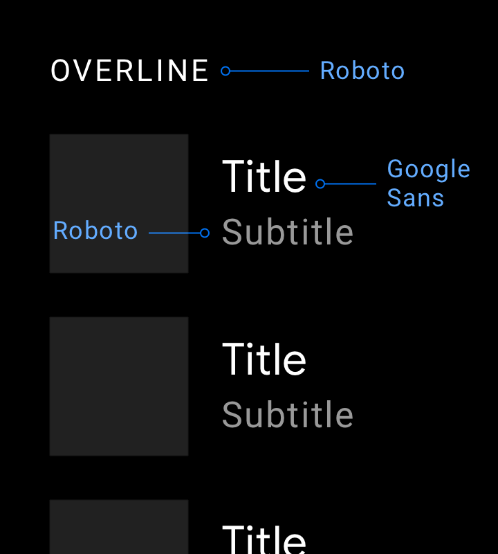 Si vous utilisez une police d'affichage plus adaptée au texte de grande taille, telle que Google Sans, utilisez des tailles de police d'au moins 32 dp. Utilisez Roboto pour un texte secondaire plus petit, car il offre une bonne lisibilité à des tailles inférieures à 32 dp.