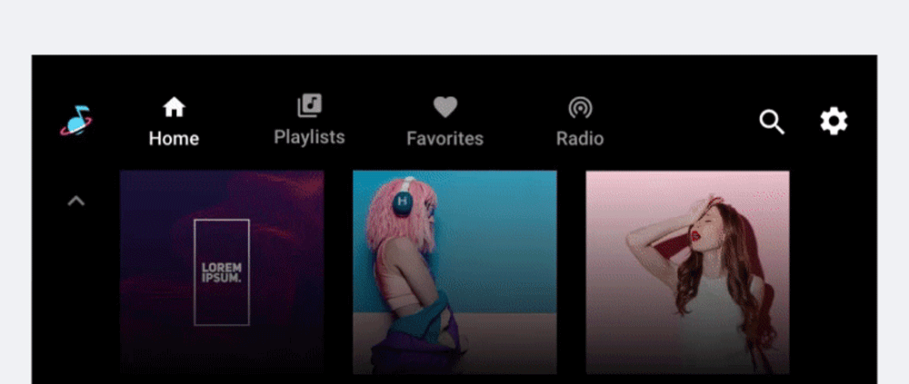 Die primäre Navigation für Content-Ansichten in einer Medien-App besteht in der Regel aus bis zu vier Tabs in einer App-Leiste (es sei denn, der Bildschirm ist extrem klein und bietet nicht genug Platz zum Anzeigen von Tabs). Mithilfe dieser Tabs können Nutzer seitlich zwischen Inhaltsansichten auf der obersten Ebene der App-Hierarchie wechseln.