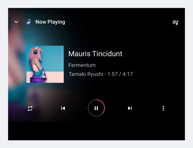 メディアアプリでは、再生ビューにあるコントロール バーを使用して、[再生/一時停止]、[前へ]、[次へ] のほか、サードパーティのカスタム操作などのコントロールを使用します。