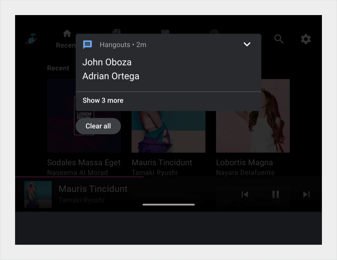 টেনে আনার গতি যখন একজন ব্যবহারকারী একটি বিজ্ঞপ্তির পাশে সোয়াইপ করে সেটিকে বরখাস্ত করা হচ্ছে এমন ভিজ্যুয়াল নিশ্চিতকরণ প্রদান করে, তারপর পরবর্তী বিজ্ঞপ্তির ঊর্ধ্বগামী গতি তালিকার গর্তটি পূরণ করে