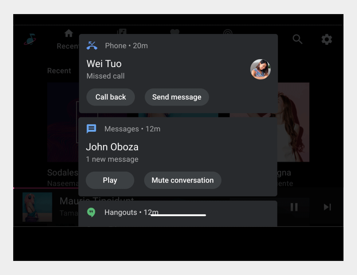 Trong các phiên bản này, thiết kế cũng có thể thay đổi đôi chút tuỳ thuộc vào danh mục của thông báo. Ví dụ: thông báo cuộc gọi có các nút và biểu tượng khác với thông báo chỉ đường.