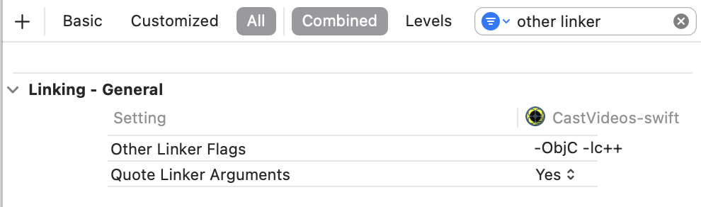 אל Build Settings (הגדרות בנייה) > Other Linker Flags (דגלי מקשר אחרים). -