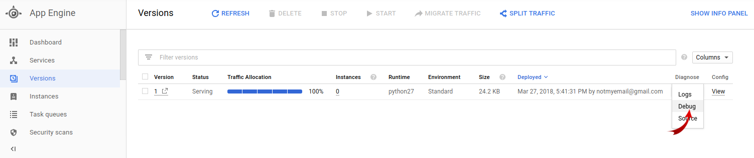 يمكننا التحقّق من نشر تطبيقنا بالإصدار 1 وتوفّره من خلال الانتقال إلى Compute → App Engine ثم النقر على "الإصدارات" كما هو موضّح أدناه: