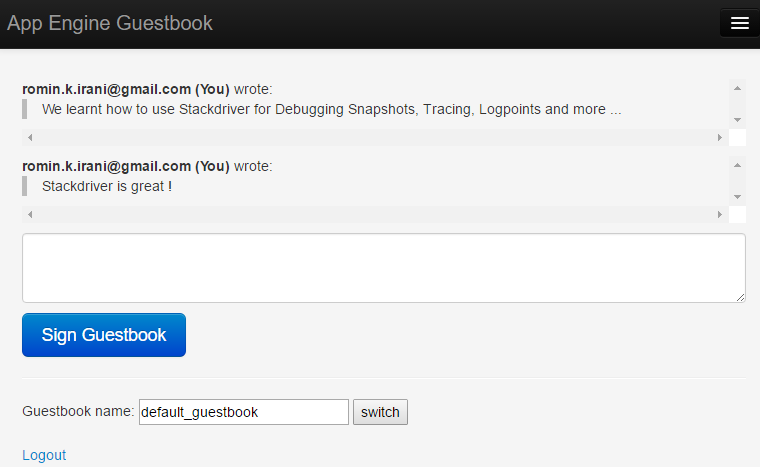 التطبيق الذي سنستخدمه هو تطبيق App Engine عادي باسم Guestbook، وهو متاح في مستودع Google Cloud Platform الرسمي على Github. يشكّل هذا التطبيق أيضًا جزءًا من المستندات الرسمية الخاصة ببدء الاستخدام. يتوفّر مشروع Github على الرابط : https://github.com/GoogleCloudPlatform/appengine-guestbook-python