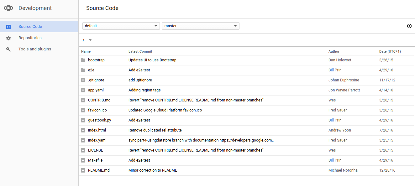 Kehren Sie nun zur GCP Console zurück und rufen Sie den Bereich „Entwicklung“ auf. Klicken Sie auf „Quellcode“. Im Standard-Repository sollten Sie alle Projektdateien sehen. Die Beispielausgabe ist unten dargestellt: