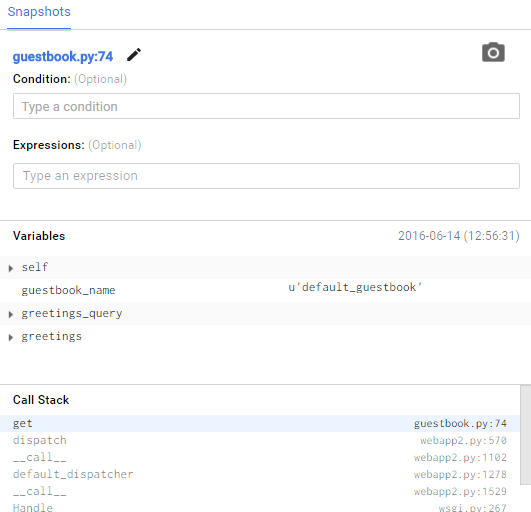 Der Code dafür ist in der Datei guestbook.py enthalten. Wir möchten uns den Code zur Laufzeit ansehen, nachdem die Liste der Begrüßungen aus dem Datenspeicher abgerufen wurde. Dies geschieht in Zeile 72. Wir können also einfach einen Haltepunkt in Zeile 74 setzen, damit wir wissen, dass Zeile 72 ausgeführt wurde.