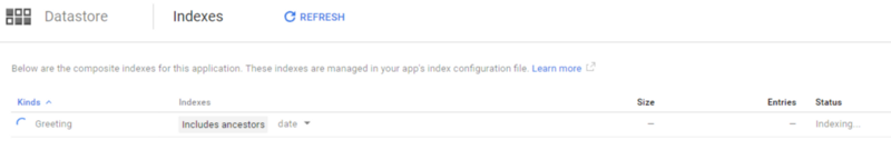 The Datastore indexes may take a while to update. To check on the status, search for "Datastore indexes" and click on Indexes. While the indexes are getting built, you will see a Status with a value of "Indexing" as shown below: