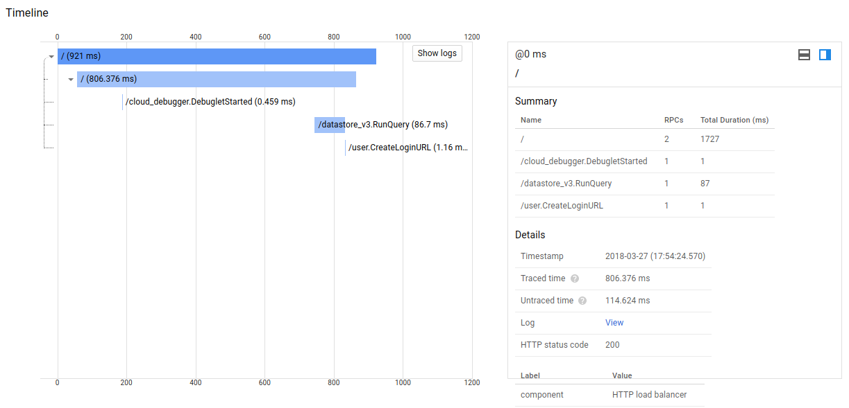 Notice, how it is able to give us a break up of the latency and which calls are taking most time. You can see from the above visualization that the datastore query is taking time. Maybe one option to look at could be caching the data to reduce that bottleneck. Again all this depends on your application and this should be very useful to determine which areas in your call trace might require some refactoring.