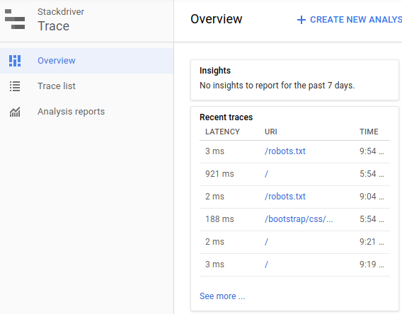 Dans notre cas, nous avons accédé à la page d'accueil ("/") et consulté / ajouté les entrées du livre d'or. Cela suffit pour que Trace nous en dise plus sur la latence. Il vous suffit d'accéder à la page "Présentation de Stackdriver Traces" pour voir une capture d'écran comme celle ci-dessous. Remarquez les traces récentes et leurs latences.