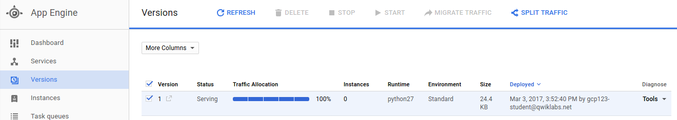 Possiamo verificare se la nostra app con la versione 1 è implementata e disponibile andando su Compute → App Engine e poi facendo clic su Versioni, come mostrato di seguito: