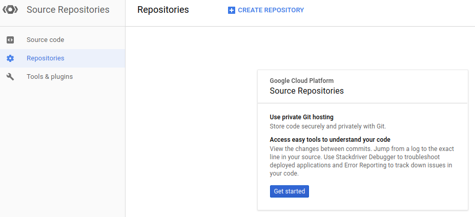Ogni progetto Google Cloud Platform offre l'hosting Git privato, ma prima dobbiamo creare un repository predefinito con cui lavorare. Vai a Source Repositories utilizzando la casella di ricerca della console :
