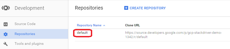 Nhấp vào "CREATE REPOSITORY" (TẠO KHO LƯU TRỮ) để tạo một kho lưu trữ mã mới có tên là "default" (mặc định):