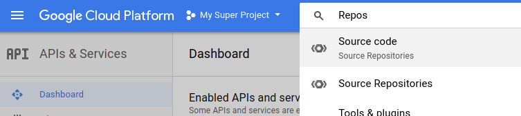 Mọi dự án trên Google Cloud Platform đều cung cấp dịch vụ lưu trữ Git riêng tư, nhưng trước tiên, chúng ta cần tạo một kho lưu trữ mặc định để làm việc. Chuyển đến Source Repositories (Kho lưu trữ nguồn) bằng hộp tìm kiếm trên bảng điều khiển :