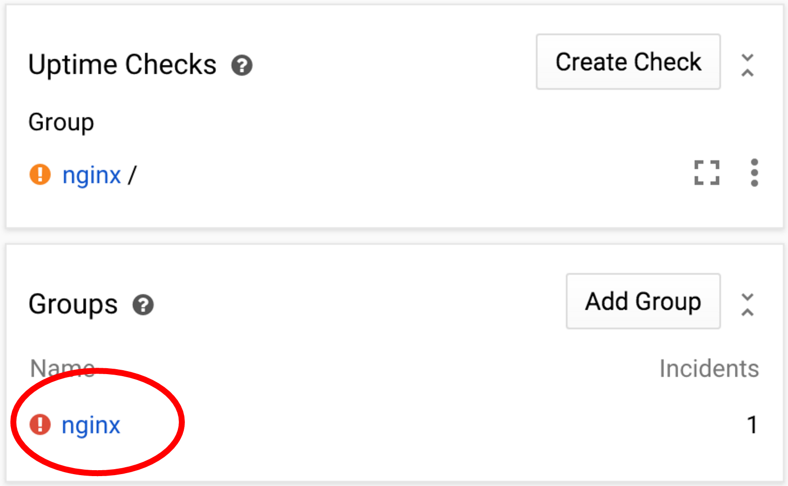 Now the uptime check that we've created should fail. As a result, an incident will be created and an alert notification email will be sent to the address you've entered above. It will take a minute for the condition to be detected (remember the duration of 1 minute when setting the uptime check?), so let's go and examine the nginx group page.