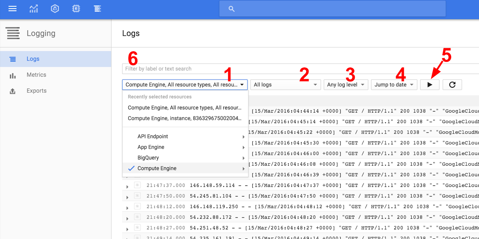 From the resource type selector (1 in the screenshot) select Compute Engine -> All resource types