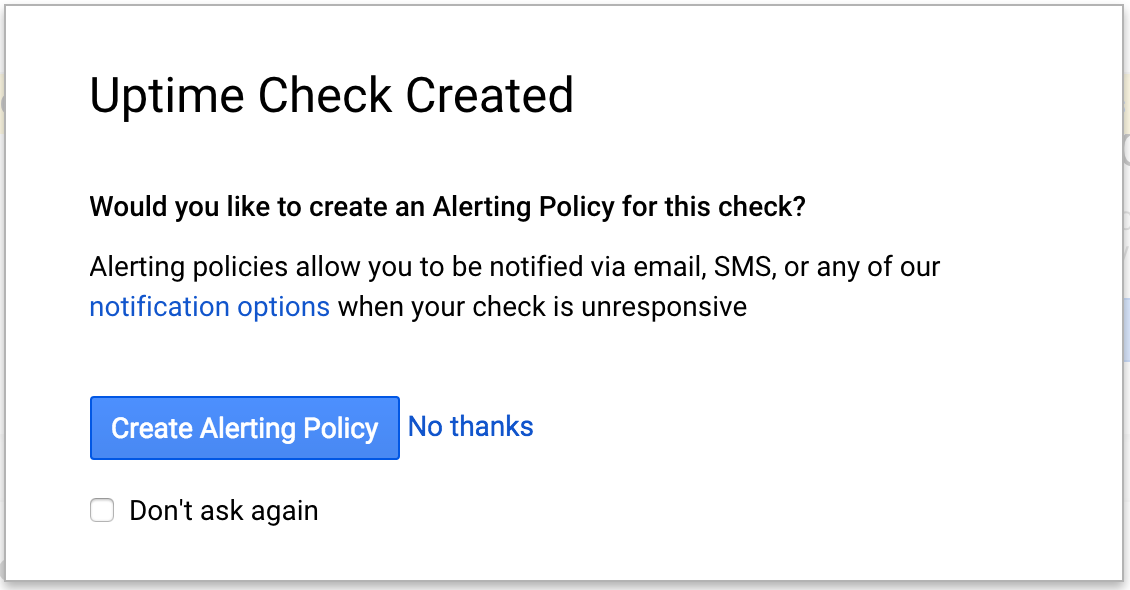 จากนั้นคุณจะเห็นช่อง "สร้างการตรวจสอบเวลาทำงานแล้ว" และระบบจะถามว่าคุณต้องการสร้างนโยบายการแจ้งเตือนสำหรับการตรวจสอบนี้หรือไม่ เราจะทำในส่วนถัดไป อย่าคลิกอะไรตอนนี้