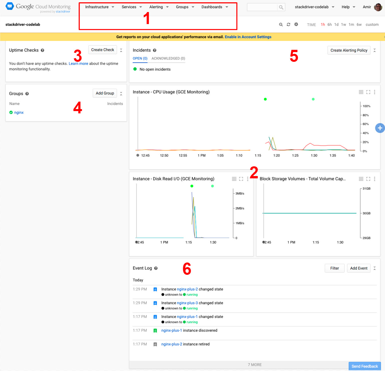 Kontrol panellerinde ve grafiklerde gezinme ve bunları kullanma konusunda bilgi edinmek için zaman ayırın. Fareyle grafik çizgilerinin üzerine gelerek neler olduğunu görün. Grafiklerin zaman süresini değiştirin (denetimler sağ üst köşededir). Konsolun sol üst köşesindeki Stackdriver logosunu tıklayarak dilediğiniz zaman "ana sayfa" görünümüne geri dönebilirsiniz.