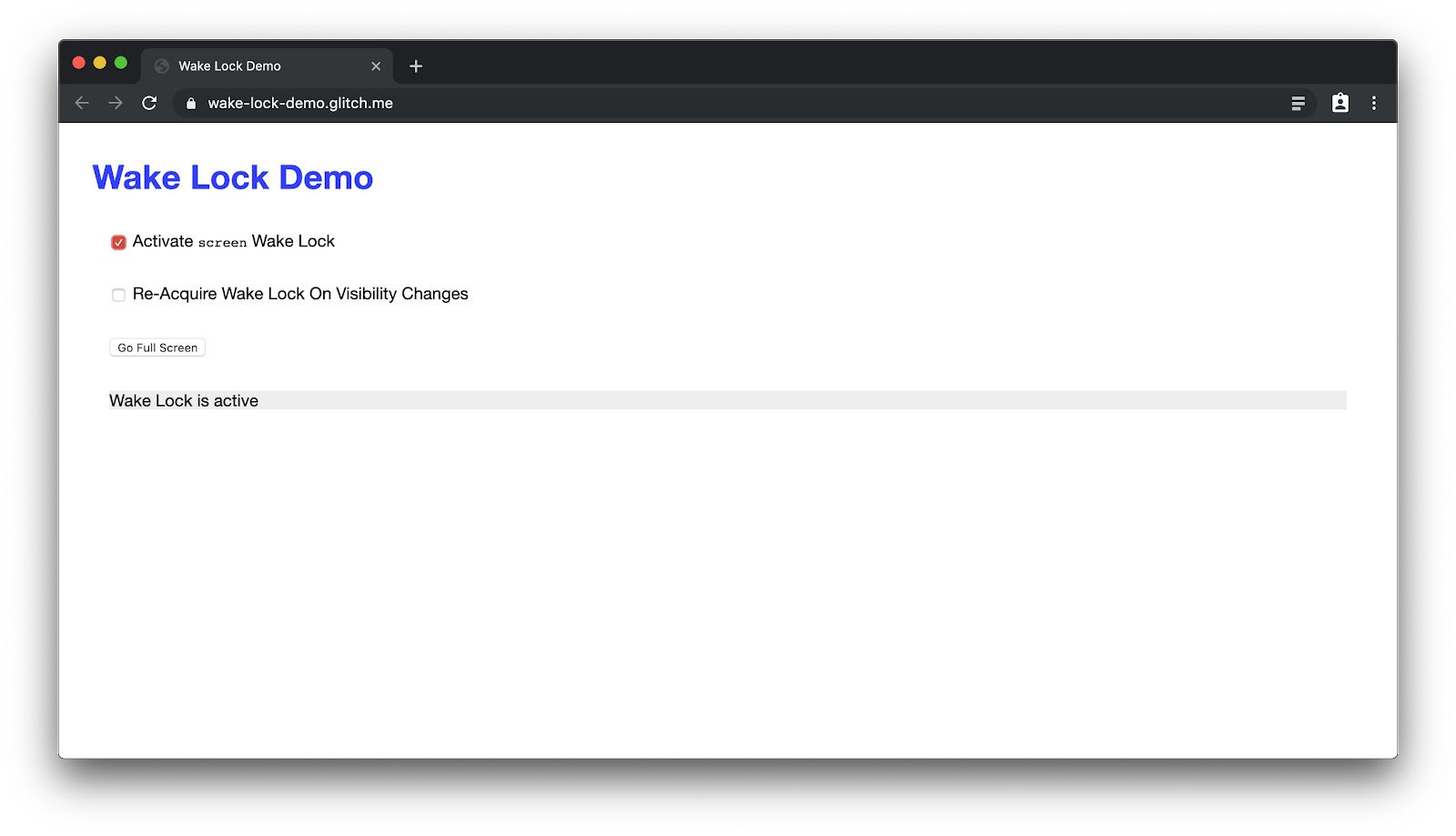 So how does this work? To find out, head over to the Glitch project for the Wake Lock demo app and check out script.js. The gist of the code is in the snippet below. Open a new tab (or use any tab that you happen to have open) and paste the code below in a Chrome Developer Tools console. When you click the window, you should then see a wake lock that's active for exactly 10 seconds (see the console logs), and your screensaver shouldn't start.