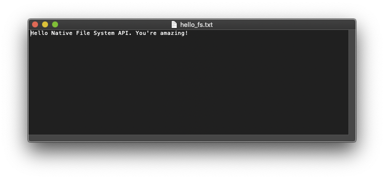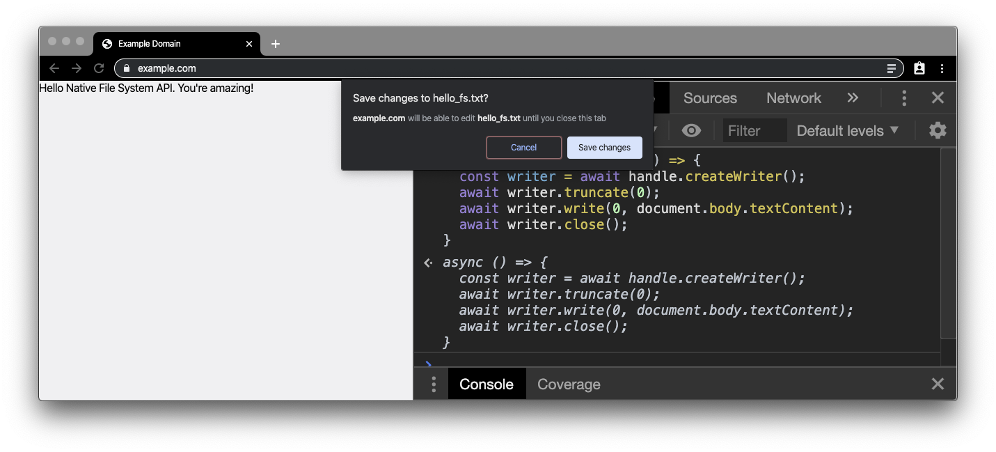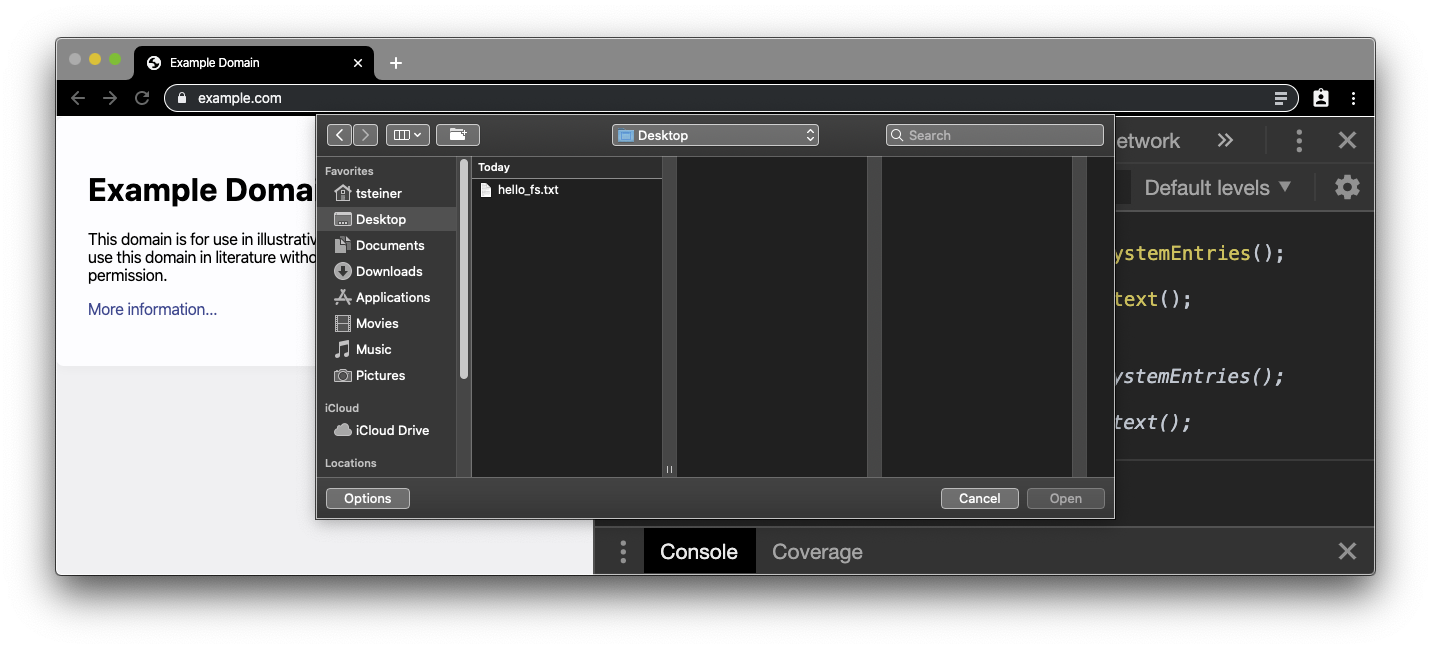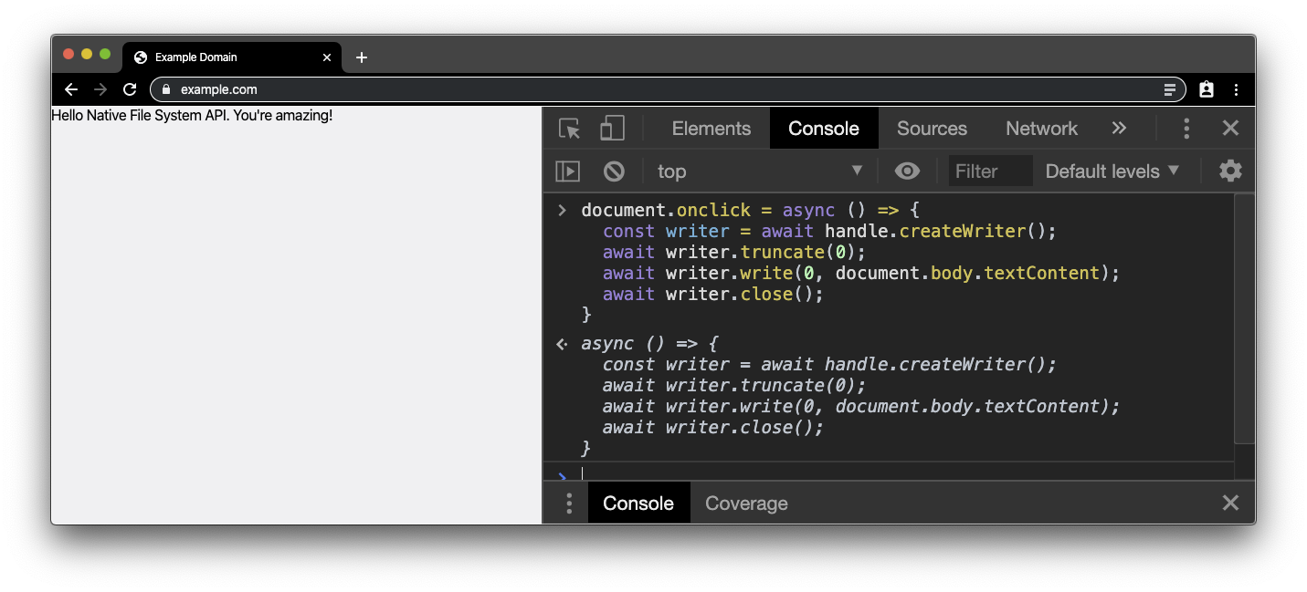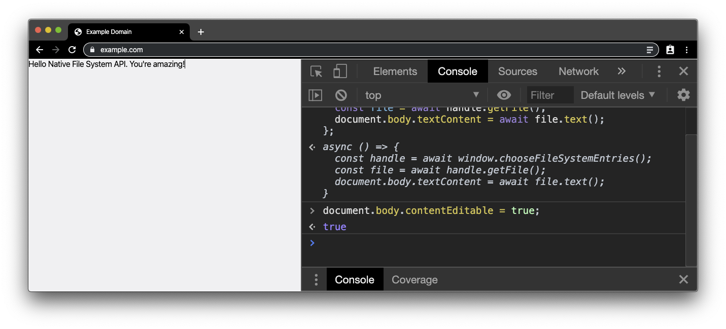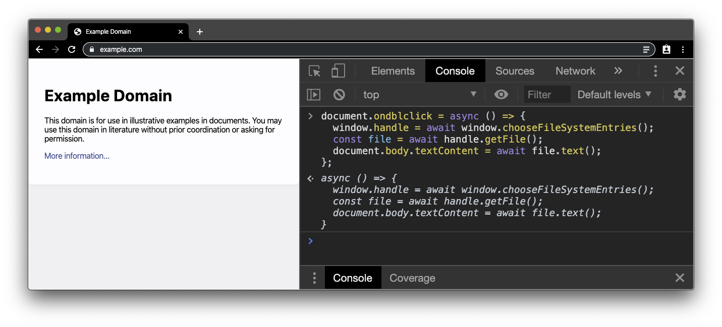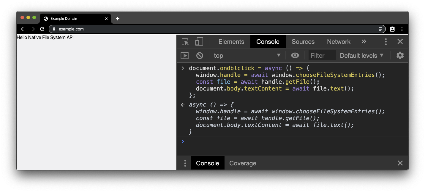 The "Hello, world" of the Native File System API is to read a local file and get the file contents. Create a plain .txt file and enter some text. Next, navigate to any secure site (that is, a site served over HTTPS) like example.com and open the DevTools console. Paste the code snippet below in the console. Because the Native File System API requires a user gesture, we attach a double-click handler on the document. We will need the file handle later on, so we just make it a global variable.